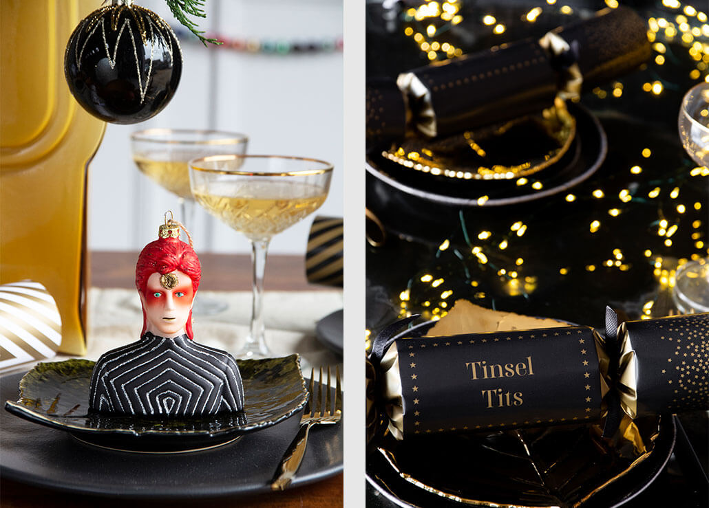 Left: Bowie Inspired Christmas Tree Decoration, Vintage Champagne Glass With Gold Rim, Black With Glitter Fireworks Christmas Tree Decoration | Right: Sweary Crackers