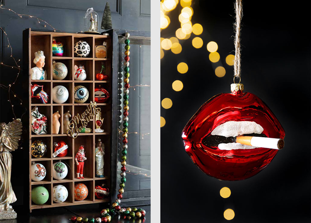 Left: Shop Our Rock'n'Roll Christmas Decorations | Right: The Red Lips With Cigarette Hanging Christmas Decoration