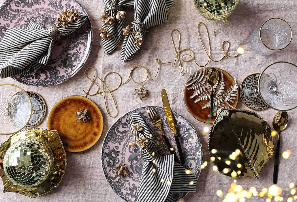 Products Featured: Dusky Pink Sakura Cherry Blossom Dinner Plate | Set Of 4 Stripe Napkins | Set Of 4 Individual Design Brass Napkin Rings | 16-Piece Gold Cutlery Set With Black Handles | Set Of 4 Gold Bee Magnets | Christian Tortu Riviera Glossy Gold Leaf Plate | Roda Mustard Stoneware Small Side Plate | Set Of 4 Leopard Print Coasters | Vintage Champagne Glass With Gold Rim | Gold Sparkle Sign | Gorgeous Gold Dried Mini Seed Pods | Gold Disco Ball Bauble Christmas Tree Decoration