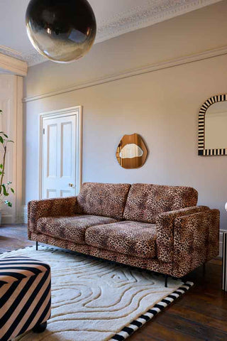 A styled image of the The Edie Leopard Print 2 Seater Sofa styled next to a leopard print rug and plants.