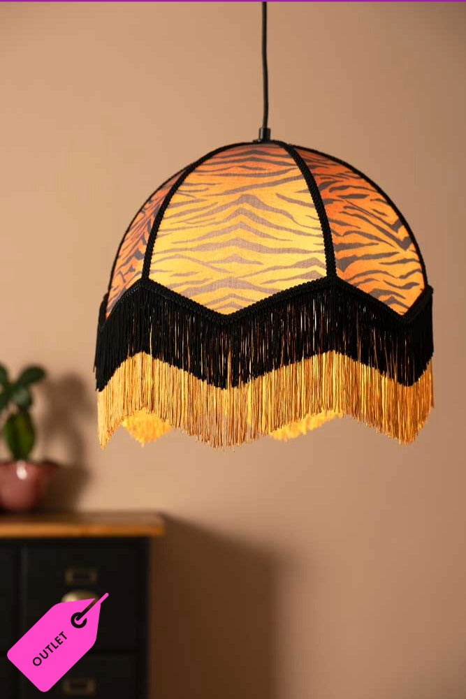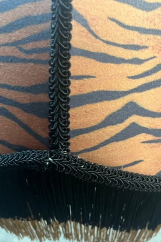 The Tiger Print Ceiling Light is bold, glamorous, and utterly irresistible. A SAMPLE piece used in a photography shoot, it shows slight imperfections in the braiding and fringe. Wrapped in a striking tiger print, it instantly adds attitude and una...