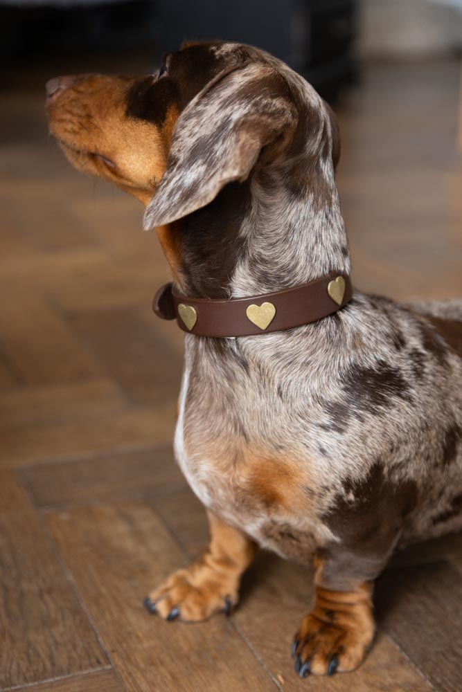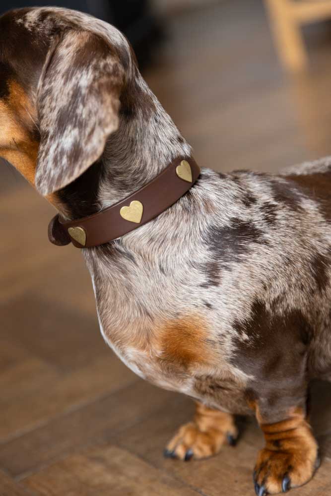 Gorgeous for every occasion from everyday walkies to Sundays at the pub, the Brown Leather Dog Collar With Hearts ensures your dog’s wardrobe is as fabulous as your own! Made by hand in the UK by Creature Clothes Ltd, the supple chocolate brown leather of the collar is paired with beautiful brass studs and a coordinating brass buckle. Designed to suit dogs of all sizes, from Pomeranians to Poodles, take a look at our sizing guide below to discover the perfect size for your bestie.