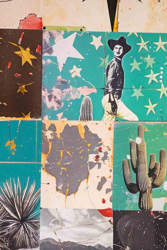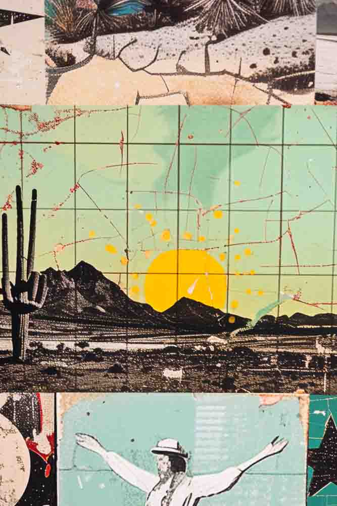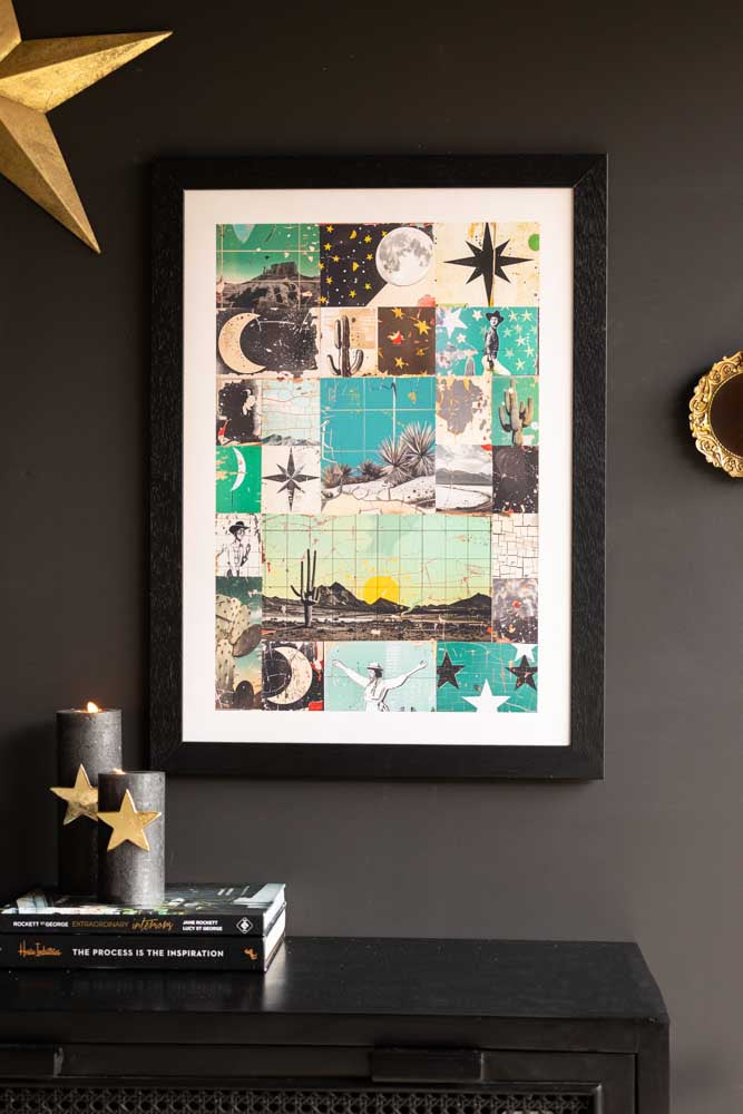 This beautiful print epitomises the essence of the Modern Western trend. Drawing inspiration from classic Americana and infused with a dark and moody colour palette, this collage marries vintage Western with contemporary abstract shapes and symbol...