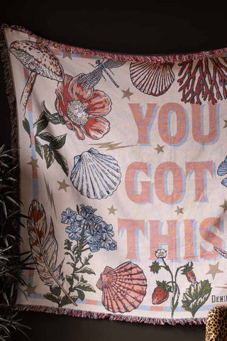 Wrap yourself in positive vibes with the Denim & Bone You Got This Woven Cotton Throw. This beautiful throw features an array of delicate patterns including shells, flowers, and serene wildlife, all of which are woven into a soothing colour p...