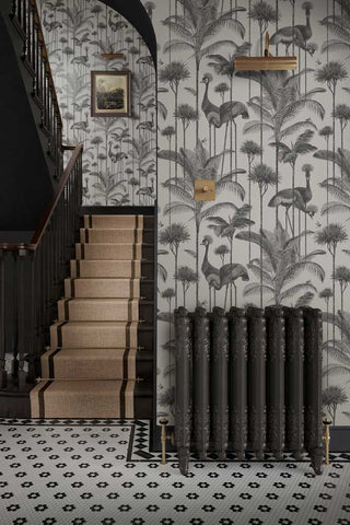 Elegance meets whimsy with Crane Fonda, a design that showcases the stately grey-crowned crane amidst lush palm trees. This wallpaper exemplifies Divine Savages' knack for combining nature-inspired motifs with a touch of glamour.