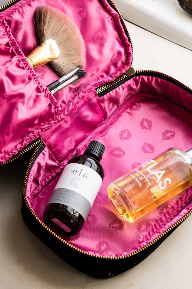 Talk about fierce and fabulous! This toiletry bag is the ultimate travel companion. Crafted from luxe black velvet and embroidered with a strutting golden tiger, bold pink florals and twinkling stars, this beauty bag is basically a work of art that also happens to hold all your beauty essentials. But it’s not just a pretty face – this cosmetic bag means business. It’s wonderfully roomy, making it perfect as a travel wash bag for your toiletries or an oversized makeup bag. There’s even a clever lover compartment, ideal for stashing brushes, bottles, or little extras. And can we please talk about the interior? Open it up and you’re greeted with plush pink velvet lining, complete with a playful lipstick stain print that’ll make you smile every time you reach for your mascara. Oh, and the hot pink tassel zip pull? That’s just the cherry on top of this already gorgeous design. Fierce, fun and functional – this wash bag is proof you really can have it all.