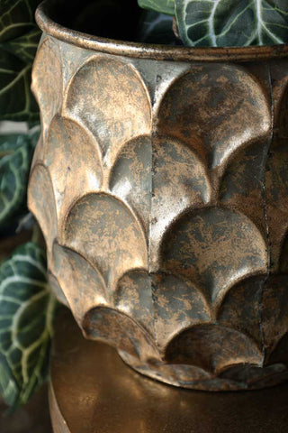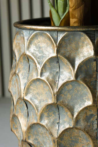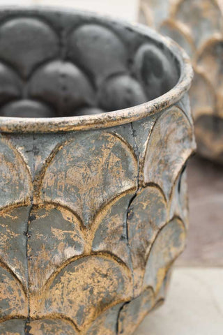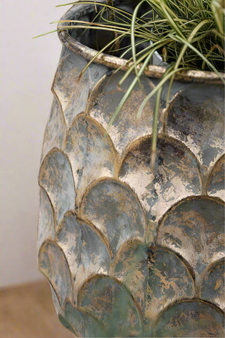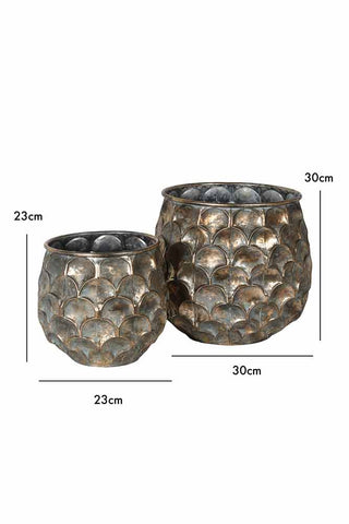 A gorgeous set that can be styled together or separately, the Set Of 2 Petal Effect Planters will make a striking style spot in your home. Showcasing a charming weathered design, these iron planters showcase a shiny green/blue hue giving them a subtle oxidised look with distressed golden hues that seep through the finish. Offering an alluring petal design, these statement planters will add a characterful look to your plants. The large planter measures 30cm in height and 30cm in diameter and the small planter measures 23cm in height and 23cm in diameter.
