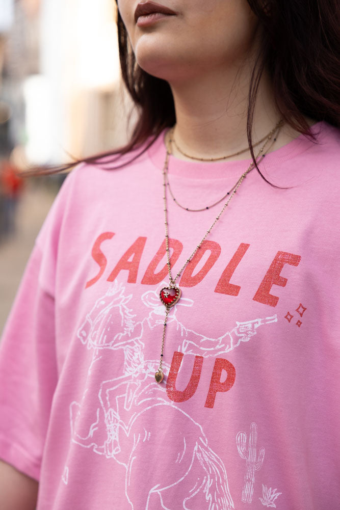 Giddy up, gorgeous – because the Saddle Up Pink Cowboy T-Shirt is here to bring all the attitude to your wardrobe. This cool sustainable cotton t-shirt features a bold white line illustration of a cowboy riding a horse with serious energy. And jus...