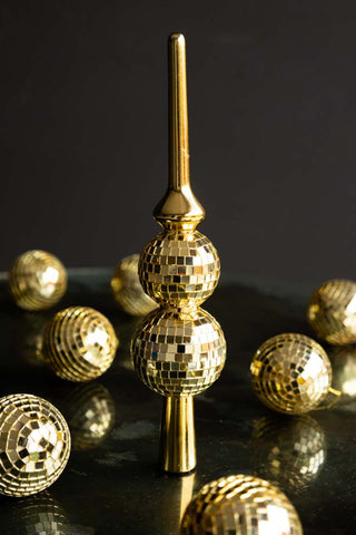 A lifestyle image of The Olive Green Palm Tree Candlestick Holder on a dark background with two other candlesticks and green and pink ornaments