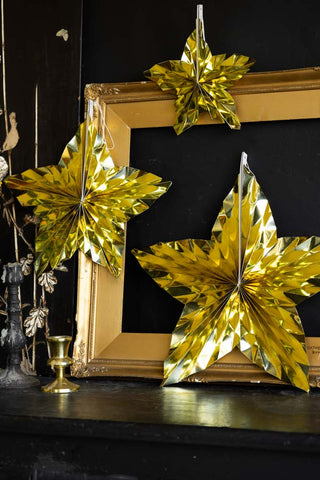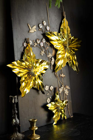 The Gorgeous Gold Cactus Candle Holder styled with lit candles inside, with other candlestick holders, greenery, a star ornament and a frame in the background.