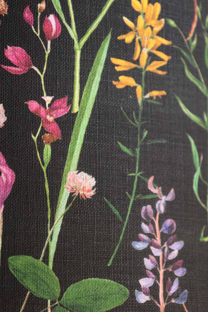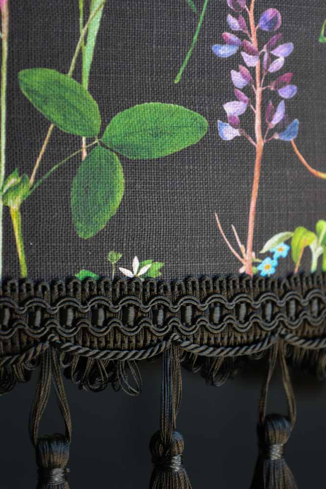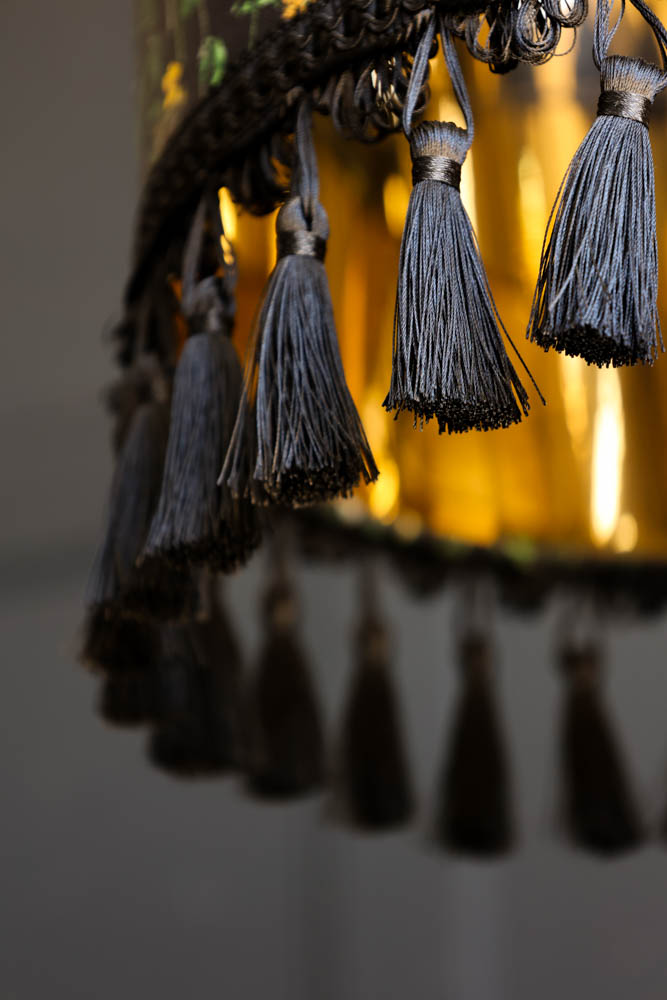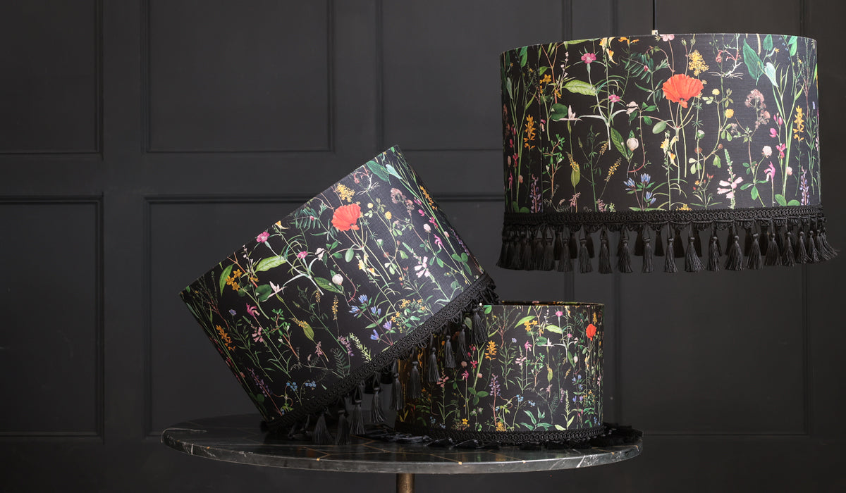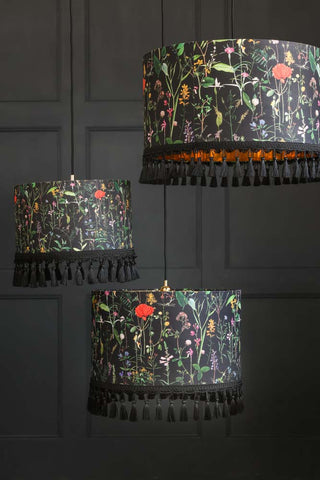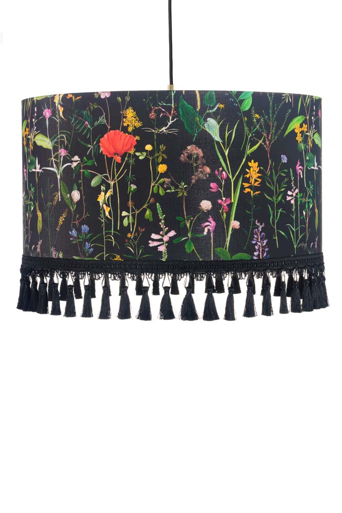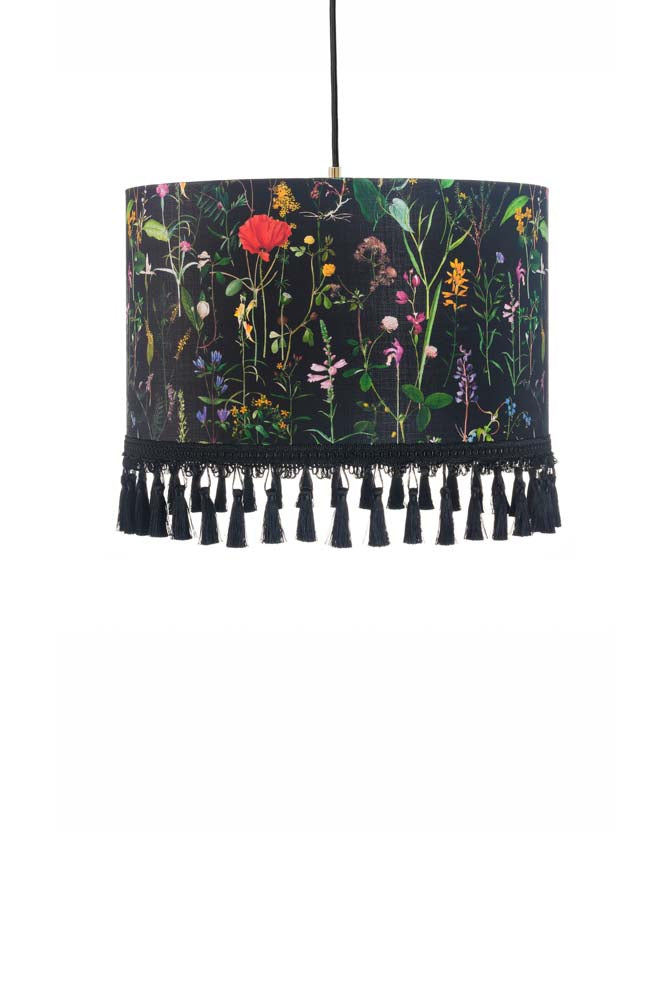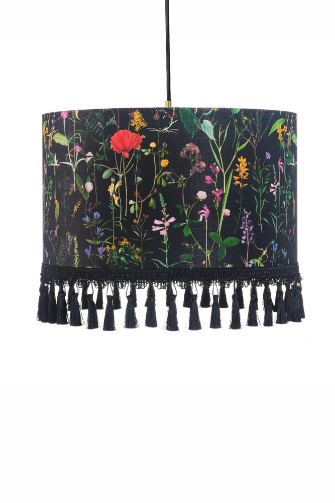 Available in small, medium and large, The Mind The Gap Aquafleur Pendant Ceiling Light showcases an enchanting floral gathering. Featuring a mesmerising array of vibrant wildflowers including cornflowers, bluebells and poppy flowers, this statement ceiling light showcases a graceful design mixed with pops of colour printed on a black linen background. Exuding a divine beauty, this linen ceiling light is finished with an intricate braided black trim, black shaggy tassels and luxurious gold lining that’ll radiate the most glorious glow throughout your interior scheme. This vintage ceiling light also comes with a 2m black braided cord and a glamorous gold ceiling rose.
