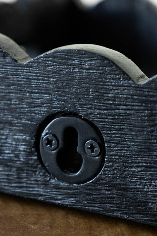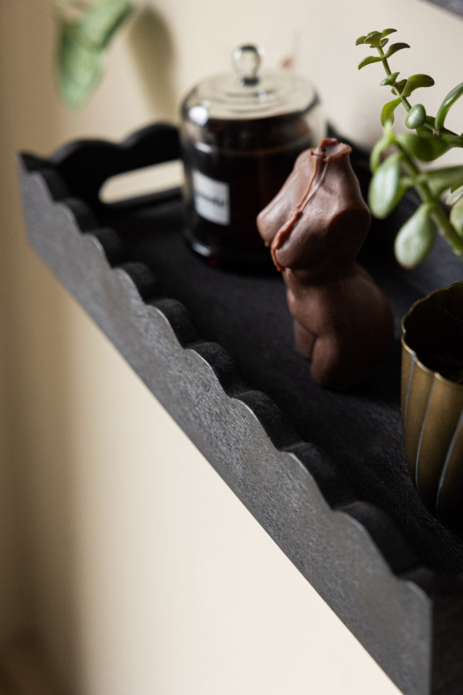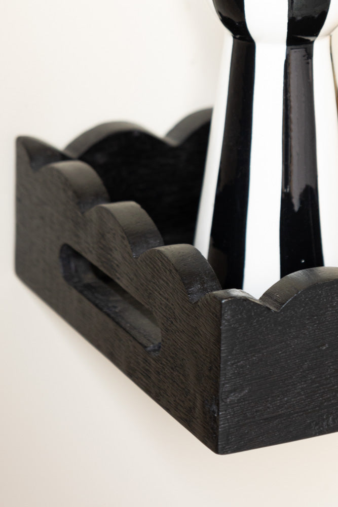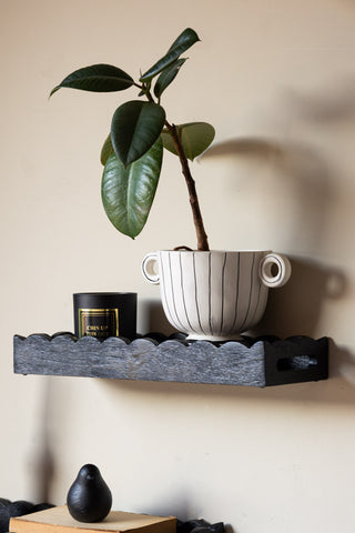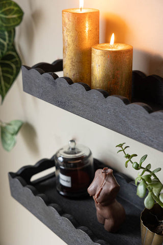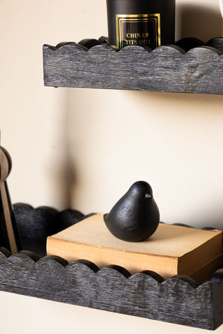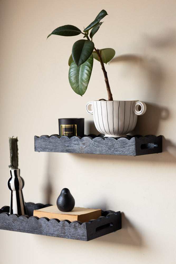 Our Set Of 2 Black Wooden Scalloped Wall Shelves is the perfect blend of practicality and chic style. The two sizes create a dynamic display, with one fitting neatly inside the other to offer a sleek look that complements a variety of décor style...