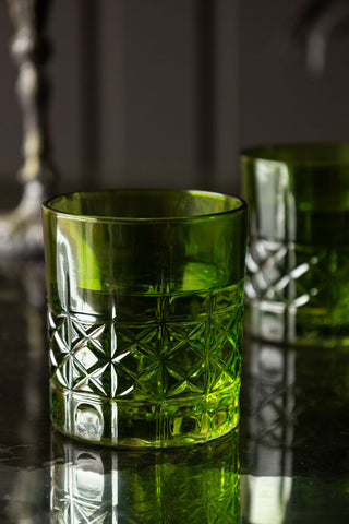 Indulge in vintage elegance with our Green Embossed Whiskey Glasses, available in two distinct designs. Choose between the sophisticated ribbed cut design or the detailed diamond cut pattern, or both! Expertly crafted, these glasses conjure up th...