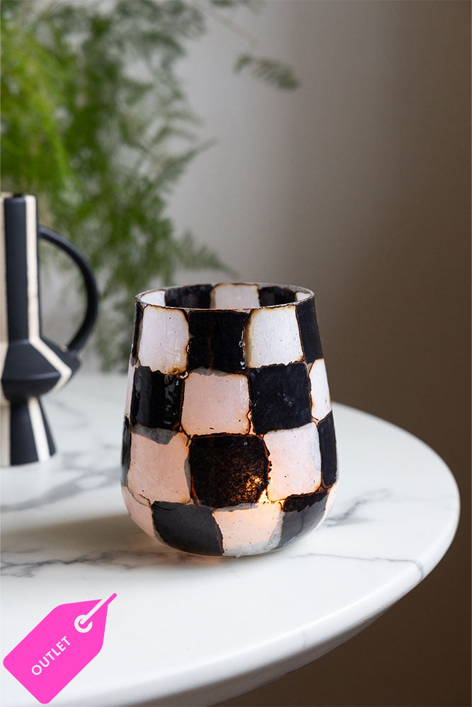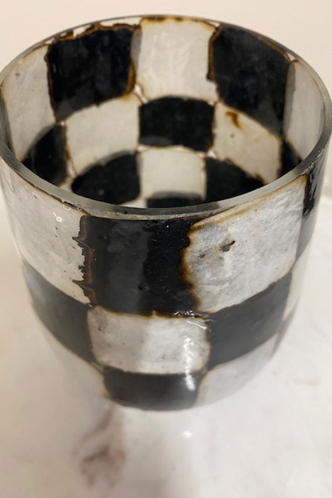 Checkered Black & White Glass Tealight Holder – SECONDS (Imperfect Glaze & Flaws on the Glass) The Checkered Black & White Glass Tealight Holder is here to bring all the cozy vibes with a touch of quirky charm. Slightly larger than you...