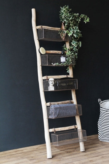 About The Wooden Ladder With 5 Baskets Shelves There is nothing to say that you couldn't display this Wooden Ladder With 5 Basket Shelves in a bedroom or any room that you wanted. But we think that it is particularly suited to the bathroom to keep...