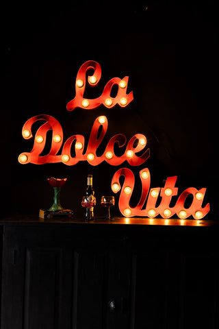 Illuminate your space with this super-fun wall light - reminiscent of fairground attractions, this eye-catching light is made from bold red steel and proclaims the phrase ‘La Dolce Vita,’ or ‘the good life,’ in a nostalgic retro font. Bright bul...