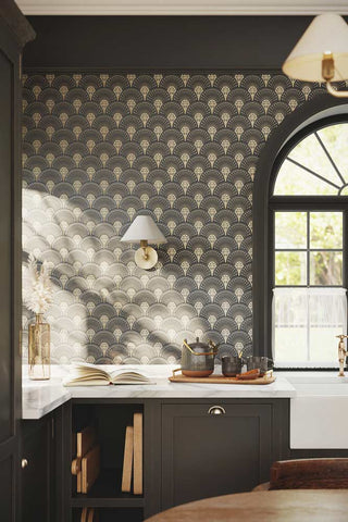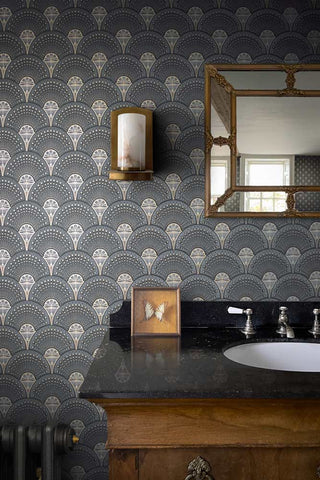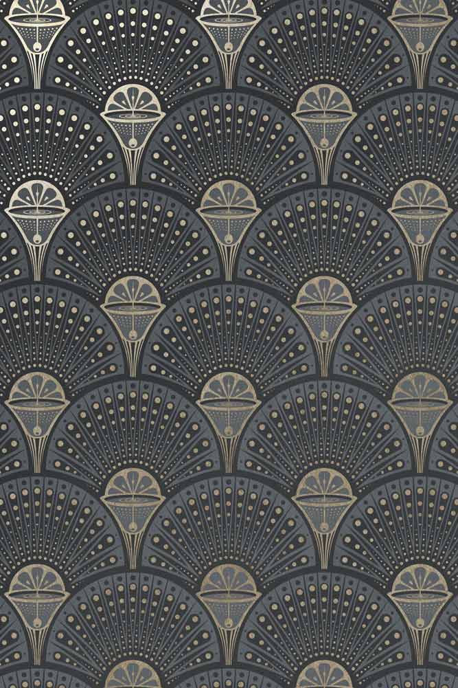 Inspired by the iconic 1920s Jazz Age era, this beautiful wallpaper design captures the magic of seductive speakeasy bars and classic Gatsby glamour. Offering a fresh take on geometric prints, the martini cocktails hidden at the centre of each fan motif create a playful nod to Prohibition New York. Perfect for darker mood-lit spaces within your home - from living rooms to bedrooms - the gorgeous colour palette of metallic gold and smokey graphite grey introduces a healthy dose of decadence and drama to the walls of your home.