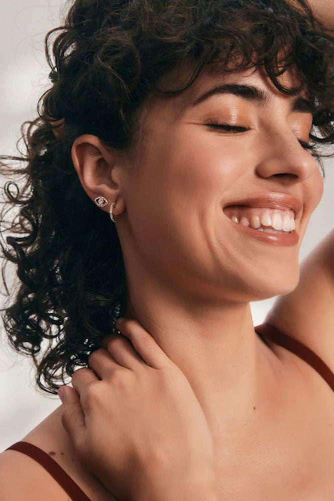 One of the Waterproof Gold Wink Face Charm Earrings styled on a model's ears.